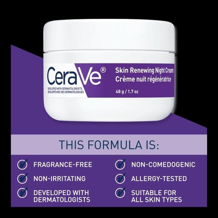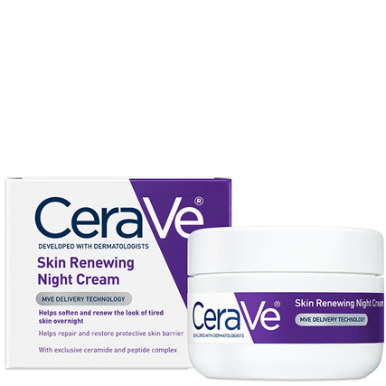 CeraVe Skin Renewing Night Cream features a complex of biomimetic peptides, hyaluronic acid, niacinamide and 3 essential ceramides that work together to lock in skins moisture and help restore your skin's protective barrier overnight.
