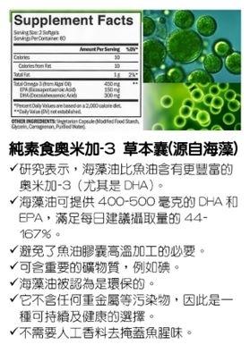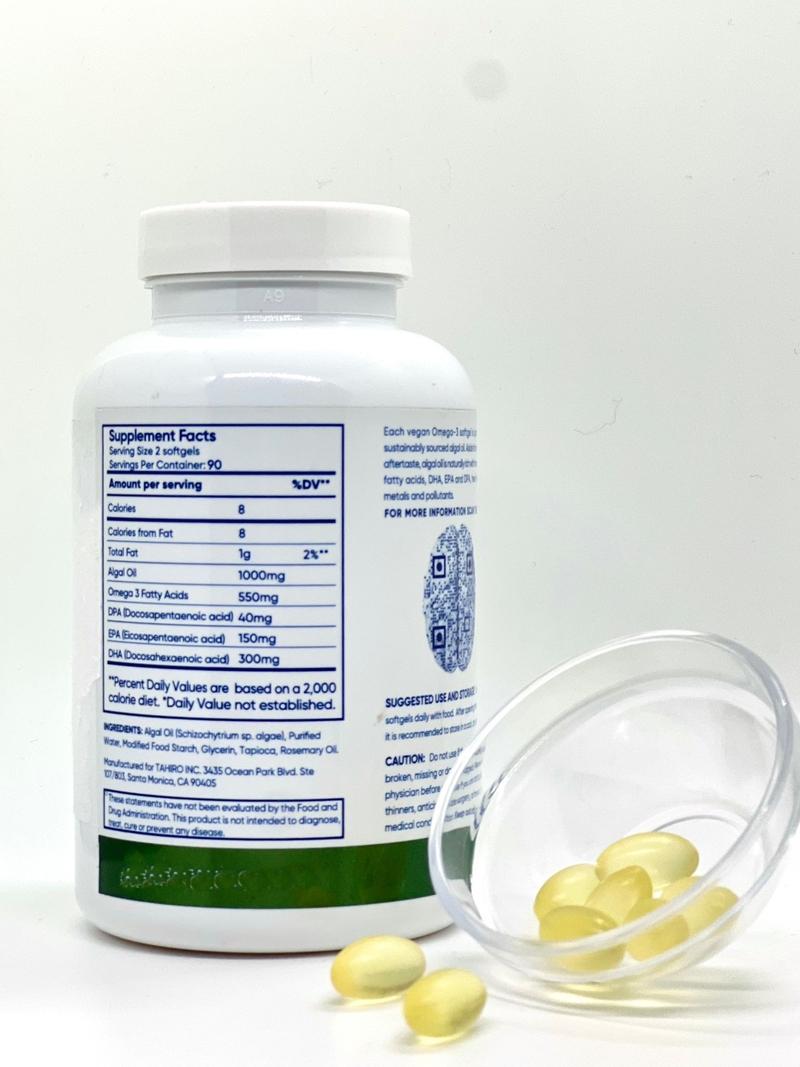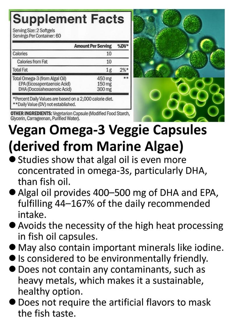 Each serving (2capsules) of algae oil provides 400–500 mg of DHA and EPA, fulfilling 44–167% of the daily recommended intake.